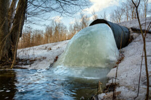 Ice dams in culverts can cause flooding for miles behind the blockage. If you notice a culvert backed up with ice dams, the first step is to reach out to your city or county authorities. For cities, that is usually a city official or maintenance personnel. In the country, depending on where you’re located, the terms you’ll want to search for are either “county engineer,” “county superintendent,” “drainage board,” or “watershed district.” Once notified, they can give us a call to break up the ice, preventing further damage.