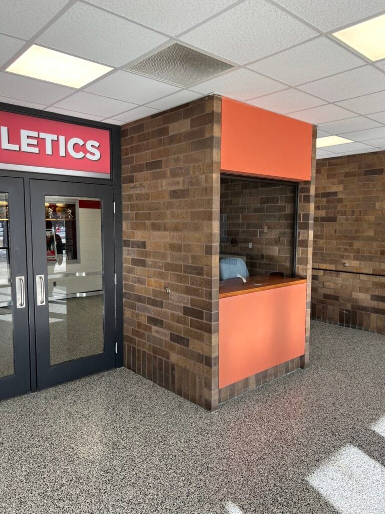 The original entrance featured four sets of double doors opening into a large vestibule. While it served its purpose as a high-capacity entryway, the athletics staff needed a more functional use of the space. Their goal was to create a 600-square-foot conference room without compromising the main entrance that students, staff, and visitors rely on.