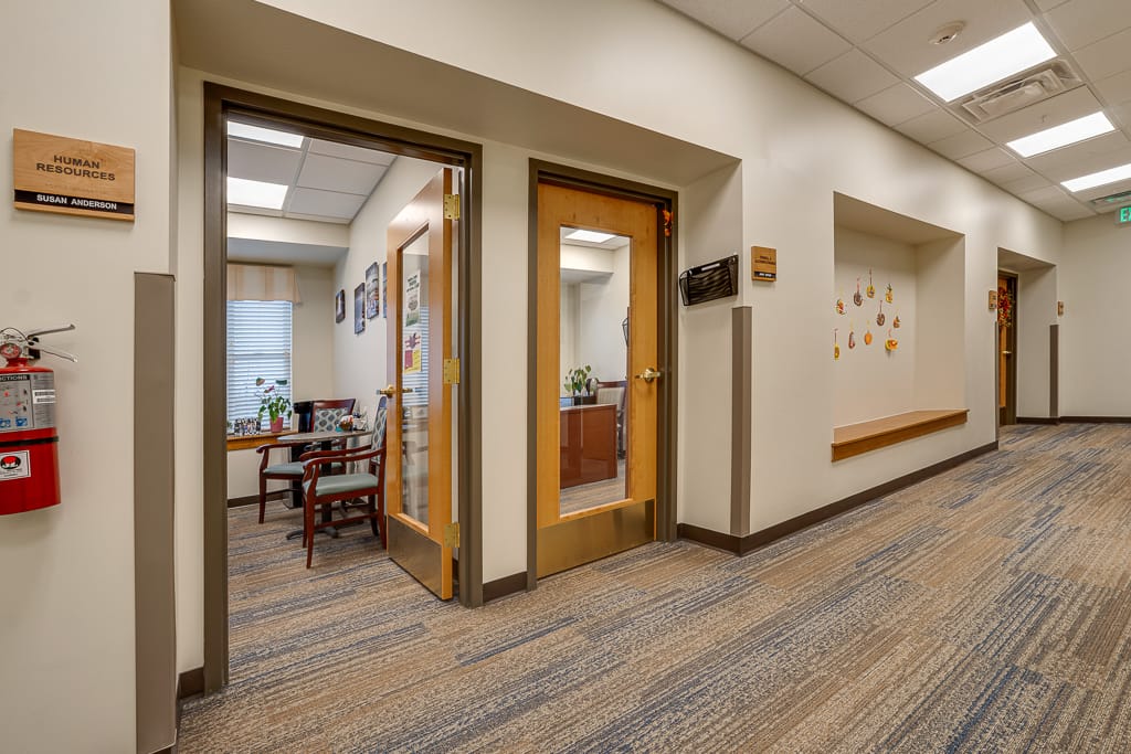 The project included a 1,100-square-foot second-story addition, providing new office and storage space to support staff operations. Inside the existing facility, extensive remodeling transformed underutilized areas into purposeful, resident-centered spaces: